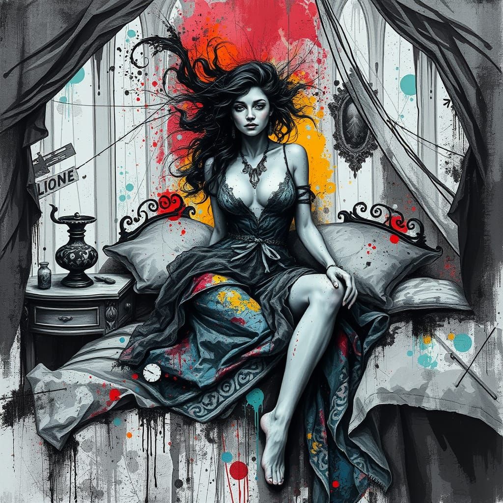 This image shows a semi-abstracted woman in her bedroom, blending with her surroundings. The artwork features expressive textures, dynamic colors, and surreal elements as mixed-media with high contrast.