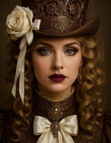 This image shows a woman in a steampunk aesthetic, wearing an ornate hat with ribbons and a rose. Her blond hair, blue eyes, and purple lips are enhanced by soft, warm lighting.