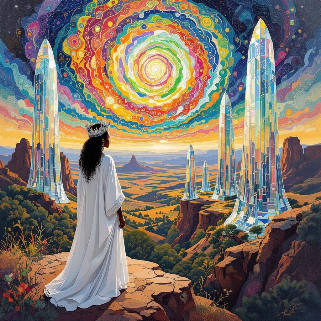 A striking picture of a woman in white robes overlooking an alien savanna. Colossal glass sculptures of sequoia trees dot the landscape under swirling, colorful skies in an ornate, symbolic style.