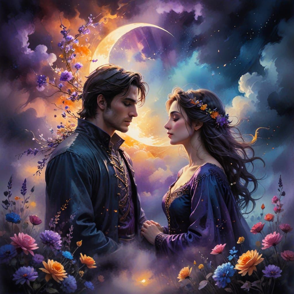 This enchanting watercolor painting captures a romantic, dreamy moment of the moon and sun sharing a passionate kiss, surrounded by mystical clouds and vibrant flowers in a fantasy world.