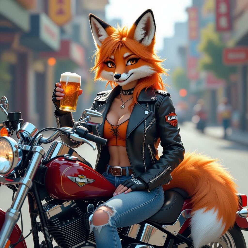 This image shows an anthropomorphic fox with orange fur dressed as an outlaw biker, relaxing on a motorcycle with a beer. The image is photorealistic, with detailed textures and lighting.