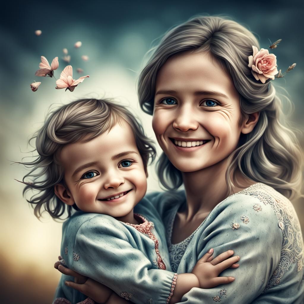 A hyperrealistic image of a happy mother holding her child, celebrating Mother's Day. The shot features intricate details, high contrast, and a cinematic, atmospheric mood.