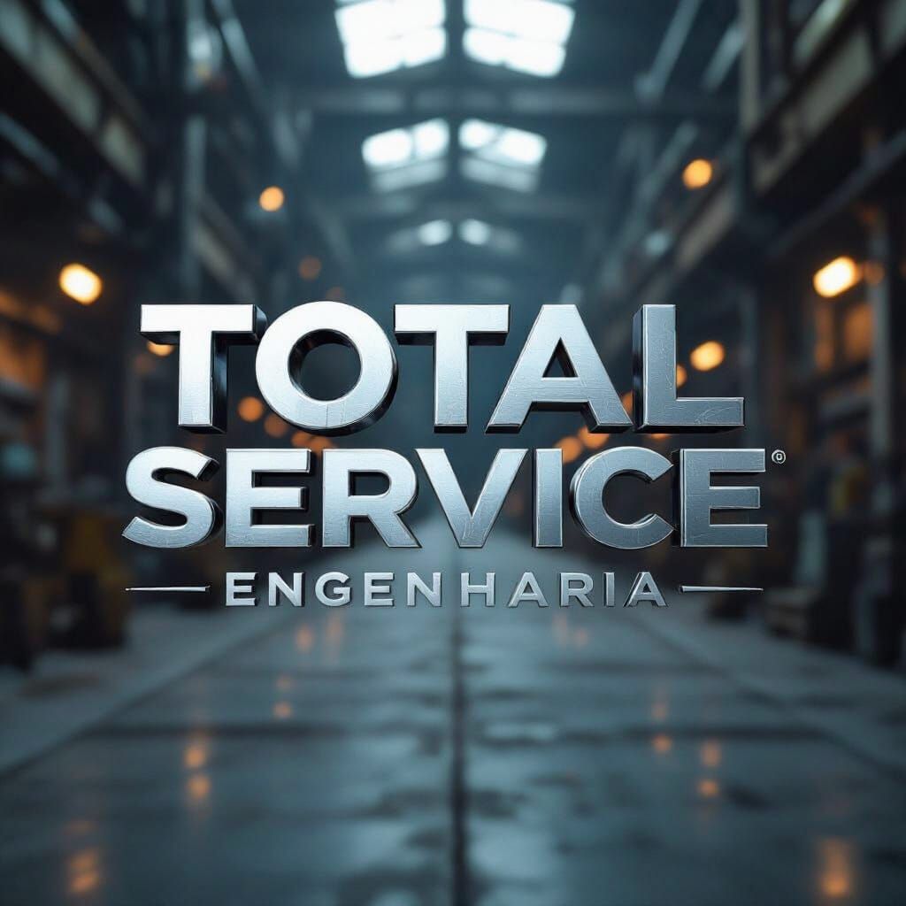 This image shows a metallic and modern logo design, perfectly suited for an engineering firm. The logo is set against an intentionally blurred industrial backdrop, with a cinematic and atmospheric feel.