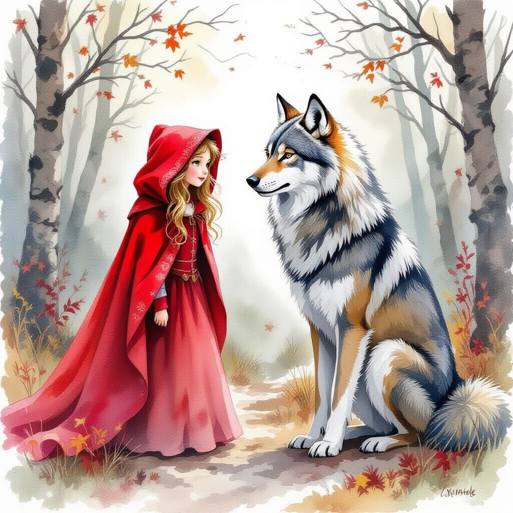 This realistic watercolor painting depicts Little Red Riding Hood disguised as a wolf and a wolf disguised as Little Red Riding Hood, showcasing a whimsical role reversal.