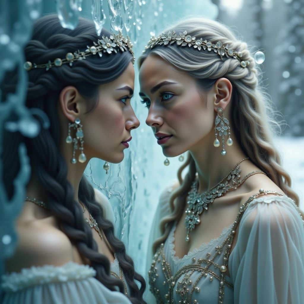 A Siberian princess gazes into an ice wall, revealing a 1700s Tsarina. This photorealistic image features volumetric lighting, cool tones, and intricate details, creating a mysterious atmosphere.