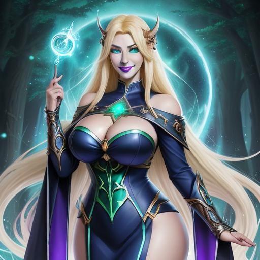 This image shows a beautiful, smiling mage in nature-themed clothing. The character has blonde hair, glowing blue eyes, green lips and a mischievous expression, rendered in an anime style.