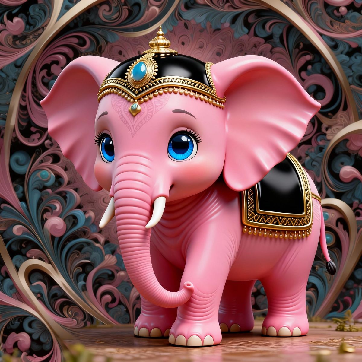 This image features a baby pink elephant with large blue eyes, adorned with a black and gold saddle and headdress, presented in an abstract vector fractal design.