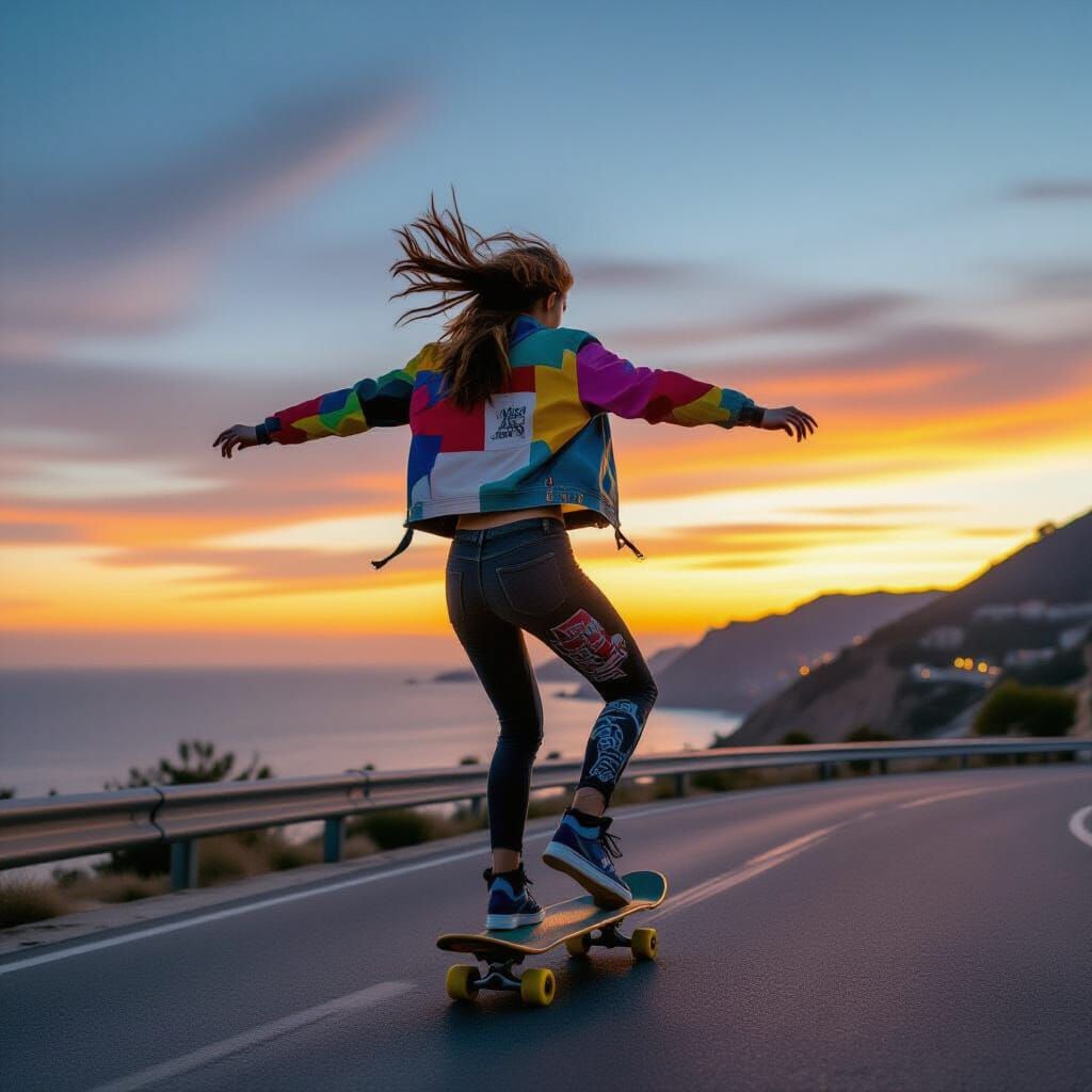 A striking picture of a female skateboarder executing a heelflip on a coastal road. She wears a multicolored jacket and neon tank top, with glitch art jeans and electric blue sneakers. The image uses hyperrealistic style.