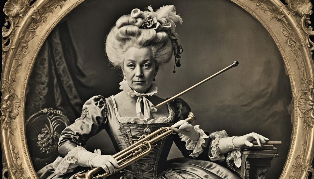 This image shows a surreal portrait of Marie Antoinette enjoying unusual hobbies. The artwork is rendered with a daguerreotype style and a subtle sci-fi aesthetic.