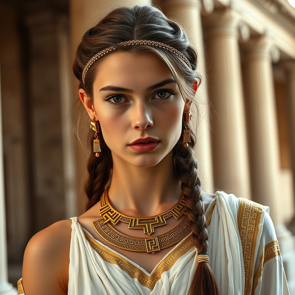 This image shows a beautiful young woman with a long, intricately woven braid, wearing a flowing white chiton and ornate gold accessories, set against a softly focused background of classical stone columns, evoking the elegance and grandeur of ancient Greece and Rome, in a cinematic style reminiscent of ...