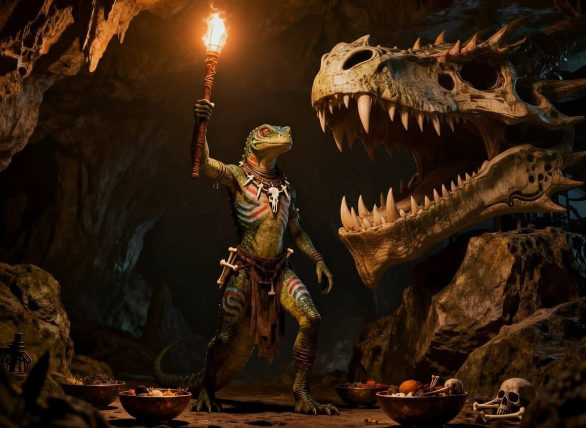 This image shows a lizard shaman in a dimly lit cave, casting a spell with a glowing staff. A massive dragon skull looms behind him, surrounded by offerings. Dark fantasy art style.