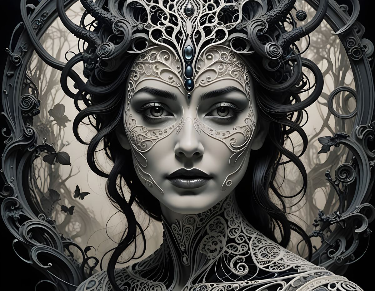 smokey cult lines, covered girl curve beard, psychedelic Biden dark glass melting samurai forest bugs Japan trees abstract hyper-vector, mini- fractal, super wave function, Zentangle, 3d shading