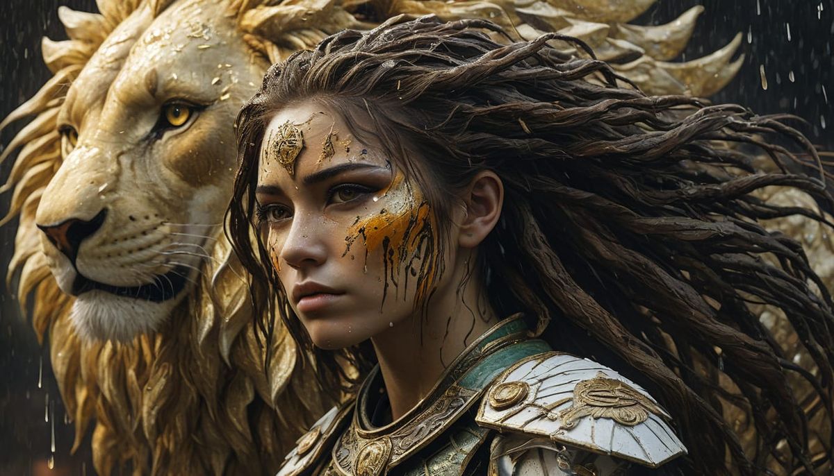 This image depicts a powerful scene of a fierce female warrior and a majestic lion, their eyes closed in a moment of intense emotional connection. The scene is rendered in a matte painting style with intricate details, blending the textures of the warrior's war paint and the lion's fur with the pouring r...
