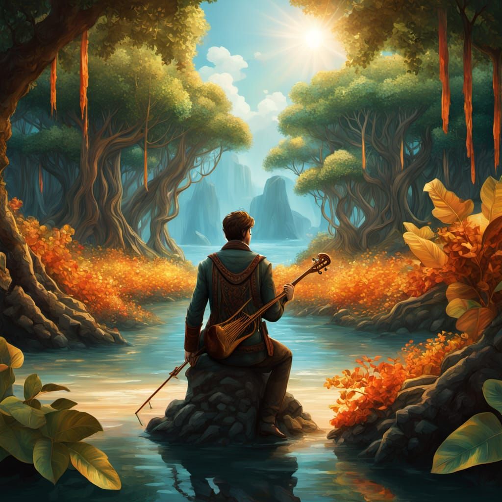 A fantasy concept art oil painting of a man with a beard by a tropical sea, holding a golden harp and glowing DNA strand. Features warm sunset lighting and vibrant colors.