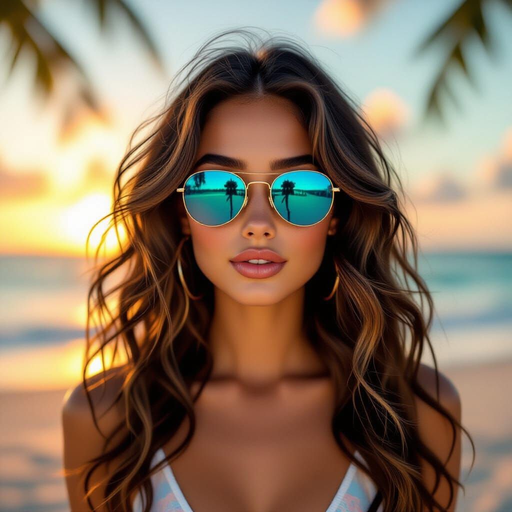 This image shows a beautiful young woman with ombre hair on a beach. She wears sunglasses and has sun-kissed skin, set against a golden sunset with palm trees in a hyperrealistic style.