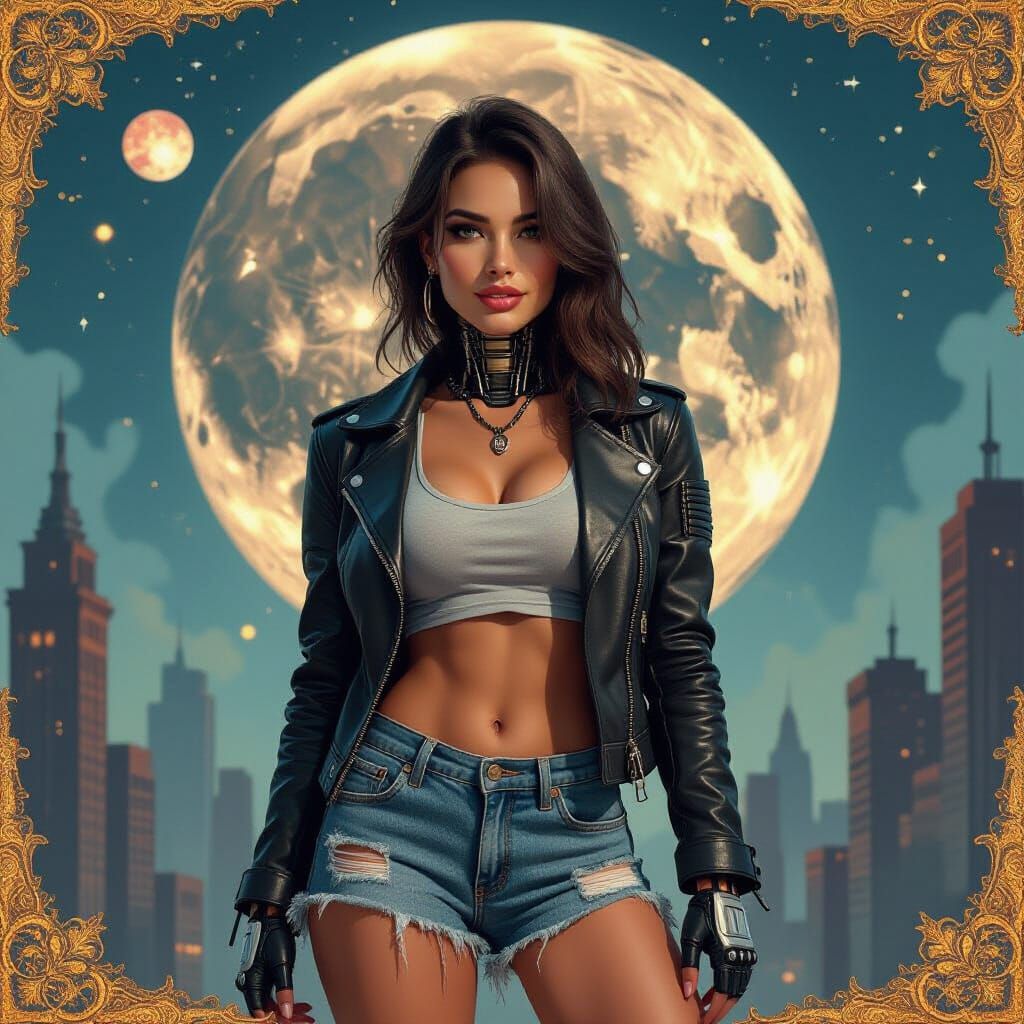 A striking picture of a female robot mechanic in a gritty metropolis. She wears ripped jeans shorts and a worn leather jacket, set against a dreamy cosmos backdrop in a pin-up aesthetic.