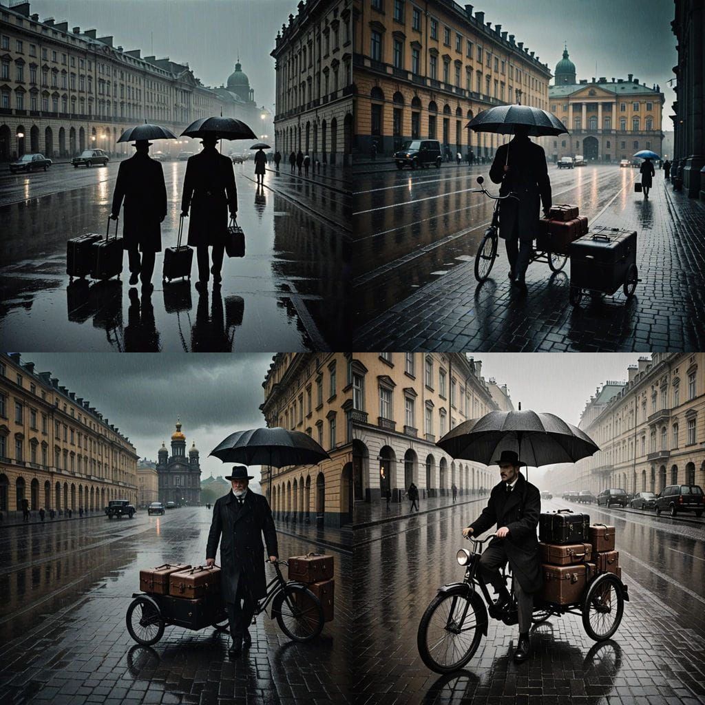 This image shows a vintage photographer standing on the historic Palace Square in St. Petersburg, dressed in black, with a camera on his chest and a black tricycle nearby, amidst a rainy backdrop.