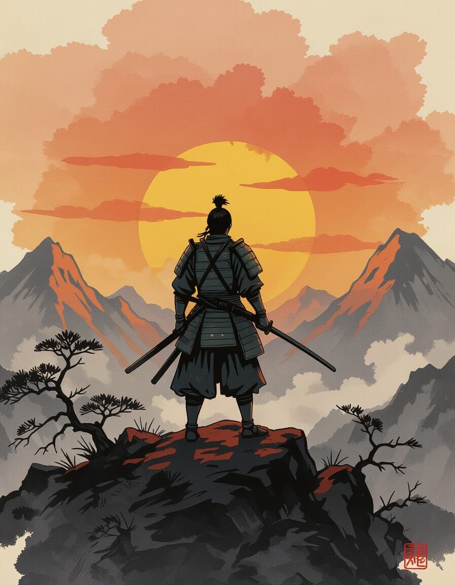 This image shows a lone samurai warrior silhouetted against a sunset on a mountain peak. The artwork evokes traditional Japanese ink wash paintings with a cinematic, dramatic feel.