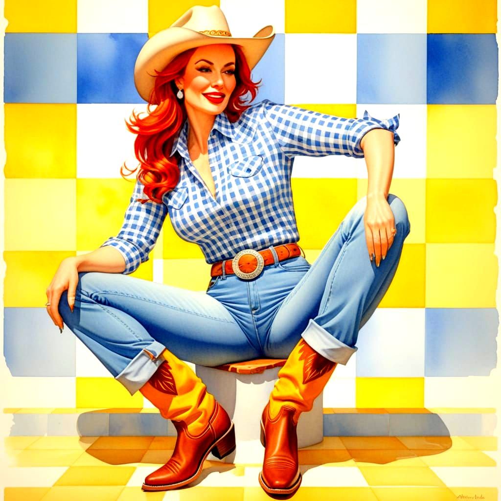 This image shows a playful, retro-style watercolor illustration of a red-haired cowgirl in a gingham shirt and jeans against a vibrant yellow background.