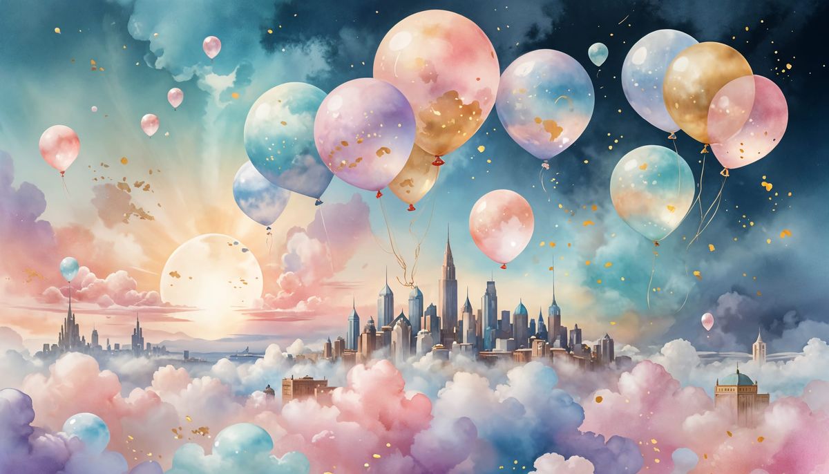 A watercolor wash image of a cloud city under a cotton-candy sky. Translucent pastel balloons drift like moons, with soft gradients, subtle gold accents, and an ethereal glow.