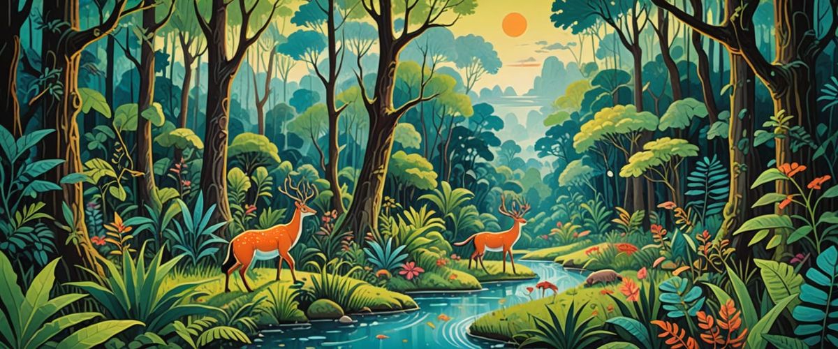 This naive landscape painting depicts a serene, prehistoric forest glade with lush plants and creatures. It features a vast pale blue sky and is rendered in bright, dreamy colors with soft lighting.