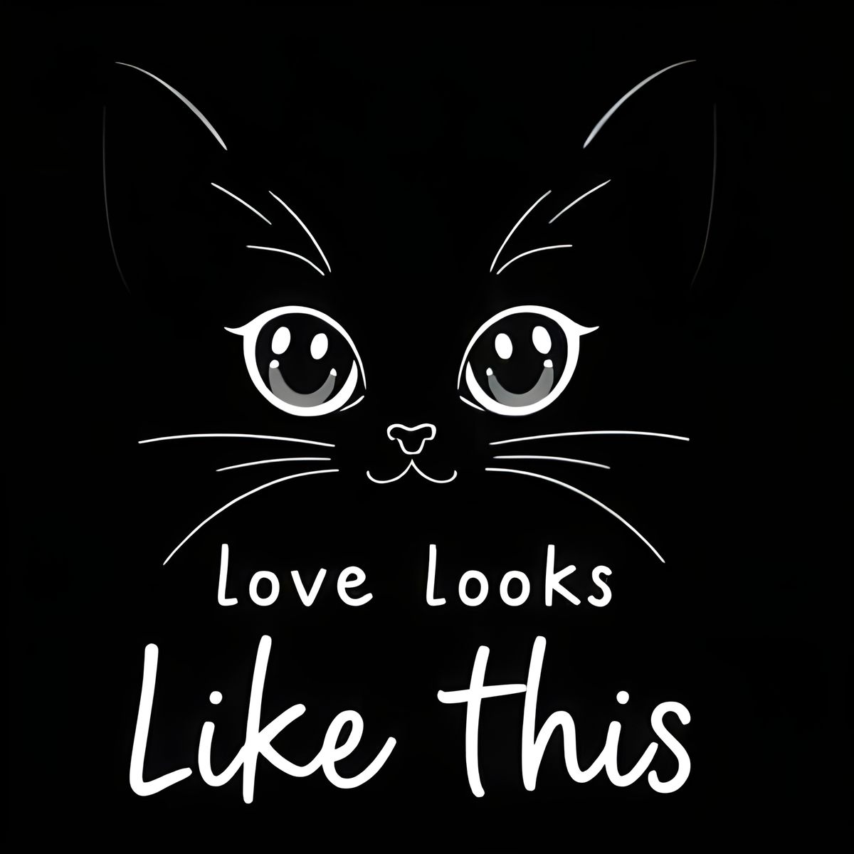 This image features a sleek vector silhouette of a kitten's head with large, expressive eyes on a black background. The text "LOVE LOOKS LIKE THIS" is displayed in a simple white font, highlighted by soft light.