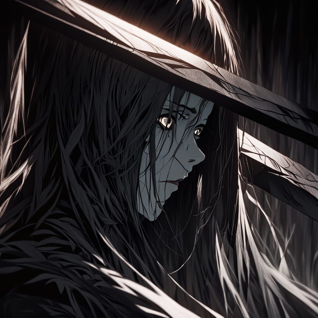 A dramatic charcoal drawing of a scarred woman warrior holding a sword. The image has vibrant shadows, bold contrasts, and elegant lines, conveying a mystical and heroic mood.