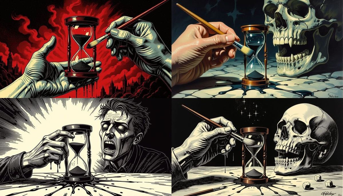 This image depicts a disturbing scene where a brush handle transforms into an hourglass, symbolizing a terrifying countdown as teeth are lost.