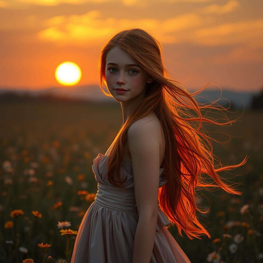 A full body shot of a teenage girl with long flowing auburn hair, wearing a flowing gown, standing in a field of wildflowers at sunset. The ...