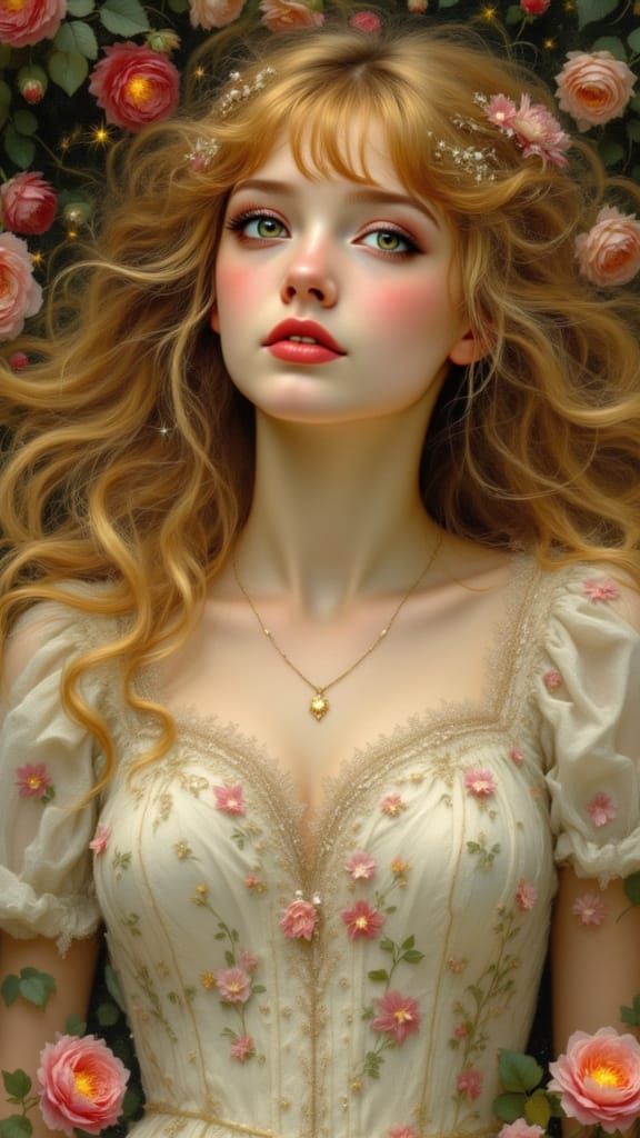 This image depicts a fair-haired young woman in a white floral dress, lying among roses and stars, rendered as an oil painting. The artwork evokes a Pre-Raphaelite aesthetic.