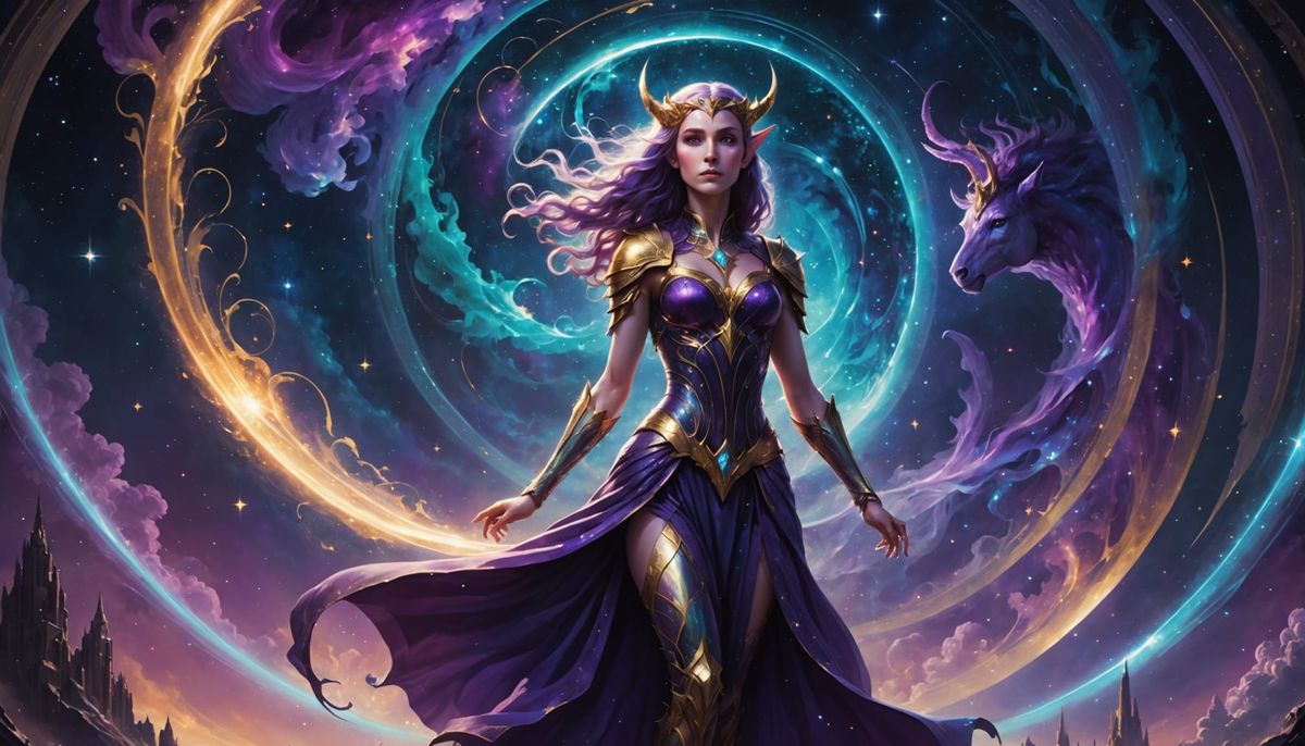 This image shows an elf woman and a unicorn in a nebula, with cosmic energy and celestial architecture. It features vibrant purples, blues, and golds with cinematic lighting.