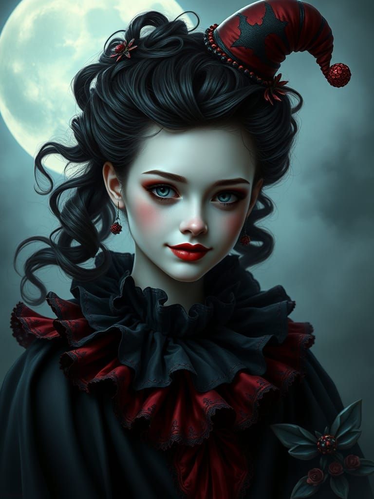 This enchanting portrait depicts a young woman transformed into a mystical dark clown, surrounded by a dreamy, moonlit atmosphere with whispers of iridescent fog, reminiscent of a 19th-century fantasy painting with intricate, jewel-toned details and an otherworldly essence.