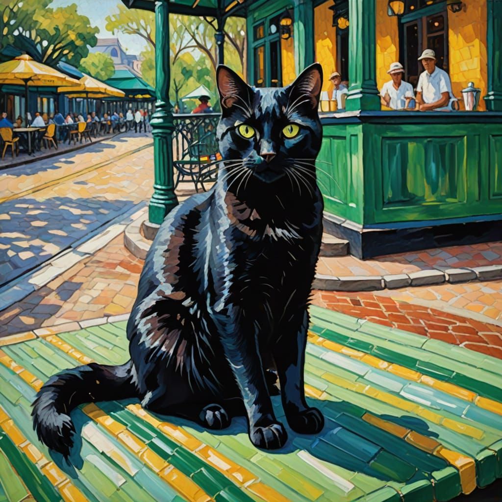 A painting depicts a black cat at an outdoor cafe in New Orleans. The art style captures an impressionistic, post-impressionistic aesthetic with thick, colorful textured paint.
