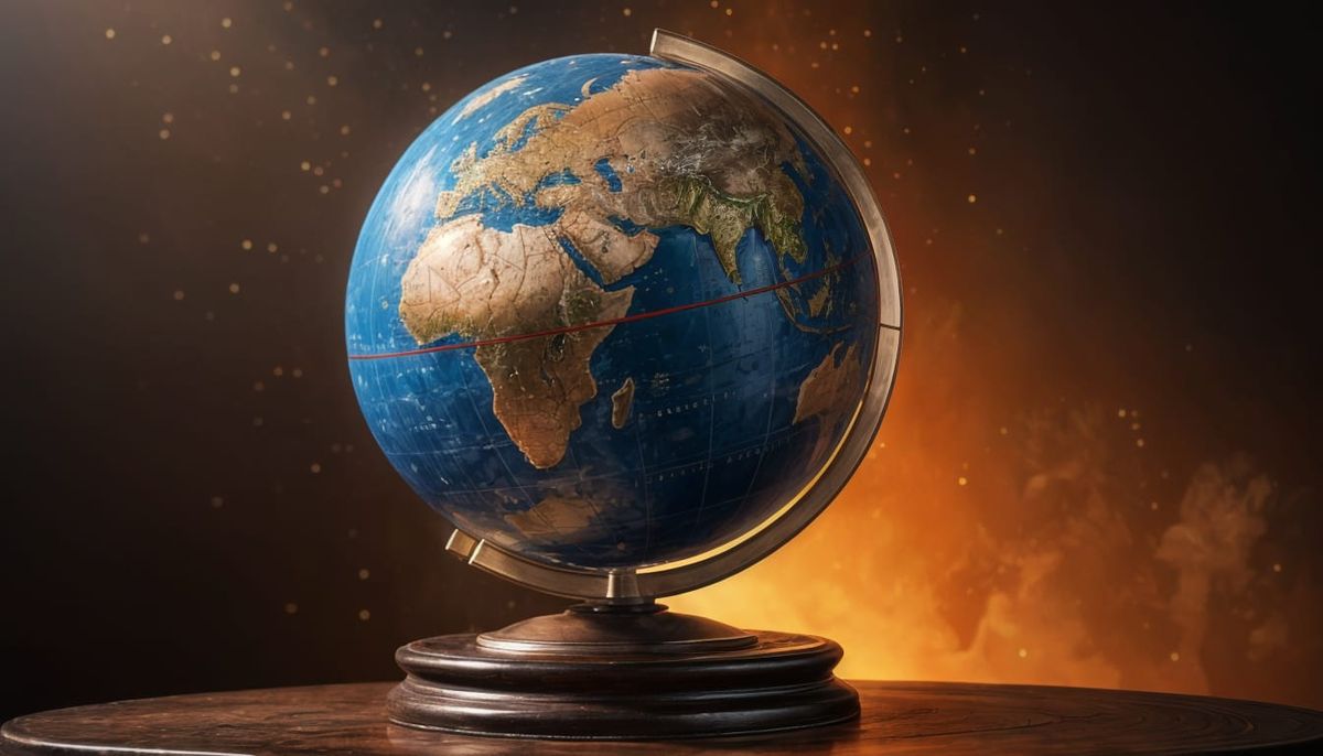 This image shows a hyperrealistic world globe mounted on a dark wood pedestal. The composition is intricately detailed with dramatic lighting against a colorful backdrop.
