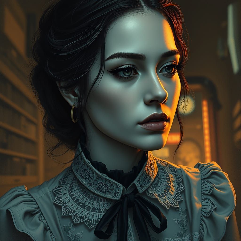 This image shows a woman lost in thought, surrounded by nostalgic cityscapes, with a deep sense of emotional intelligence. Rendered in oil-realism with vaporwave and alcohol ink textures, her face exudes a dreamy, ethereal quality.