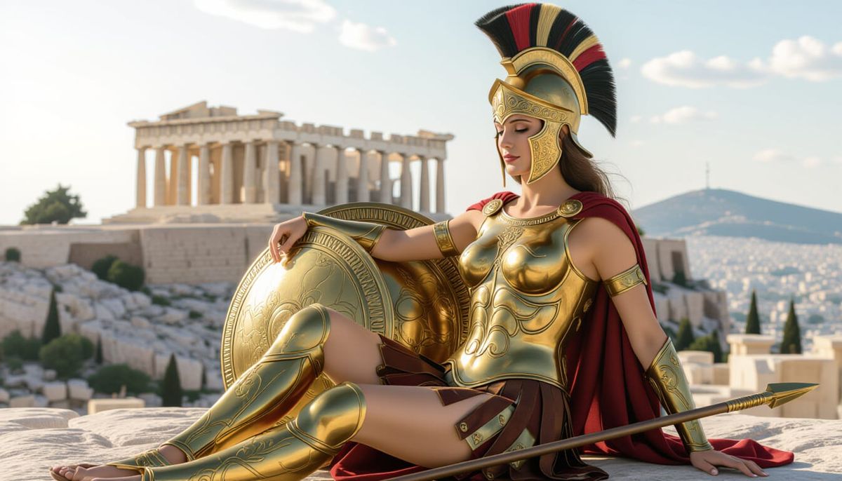 This image depicts the goddess Athena in her golden armor, seated serenely within her temple at the Acropolis. Her helmet and spear lie nearby as she enjoys a tranquil moment.