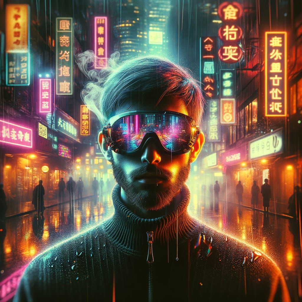 A figure with reflective goggles stands on a neon-lit, rain-slicked street. Holographic ads cast colorful light. The urban scene evokes a moody cyberpunk aesthetic.
