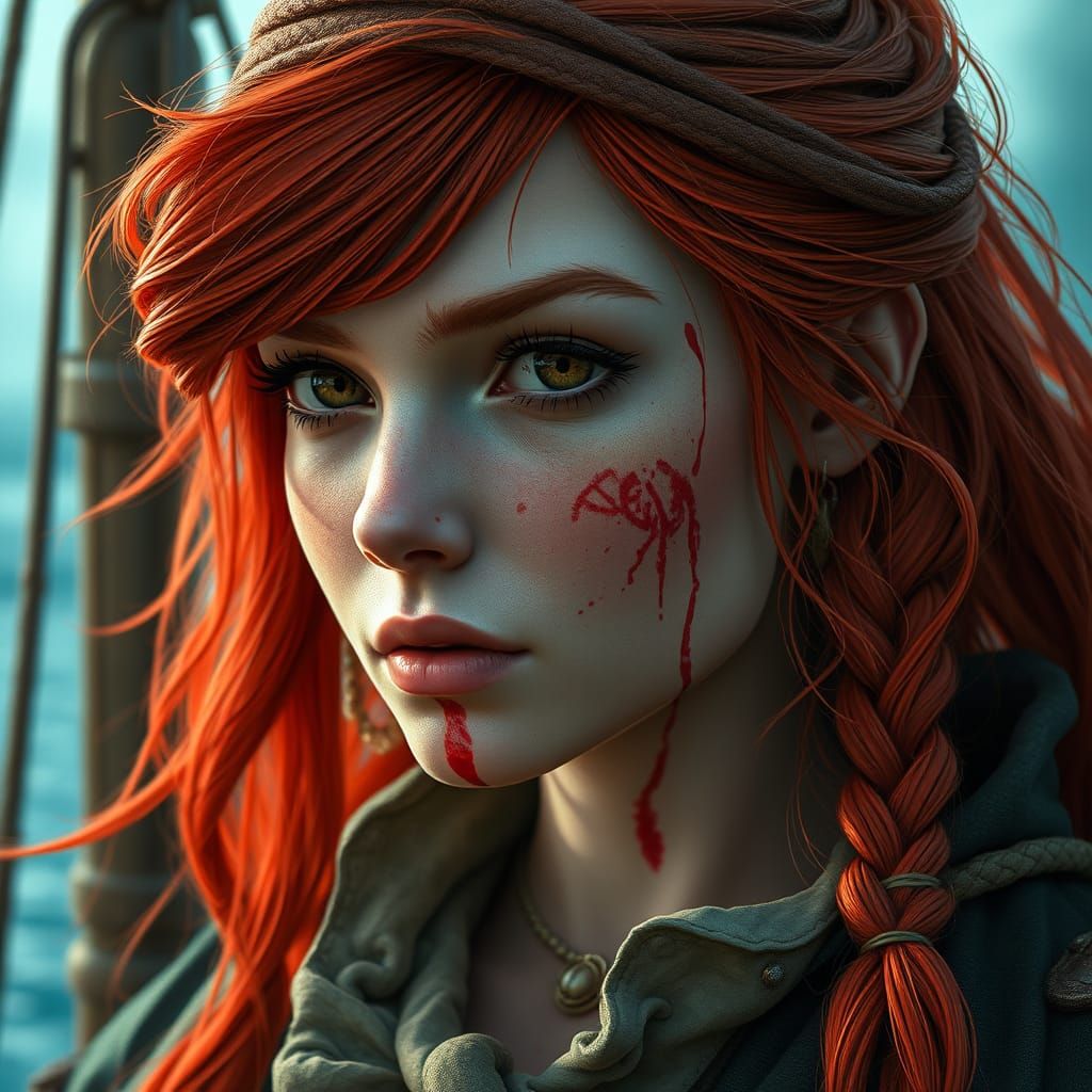 A striking portrait of a 30-year-old pirate girl with fiery red hair and intense brown eyes, set against a backdrop of mesmerizing turquoise, coral, and amber hues. Her weathered pirate garb and smudged blood add to the hyper-realistic detailing of this 8k resolution concept art masterpiece, blending dyn...
