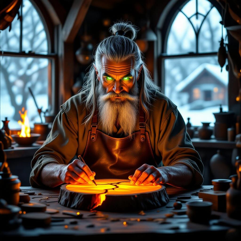 Stari stolar u radnom kožnom odelu sedom dugom kosom vezanom u rep i fluoroscentnim zelenim očima koje sijaju u staroj radionici sa specijalnim alatima obradjuje na radnom stolu komad magičnog okruglog drveta narandžaste boje sa vidljivom odsečenim čvorištem od grane i koje je providno sa odsjajem i ...
