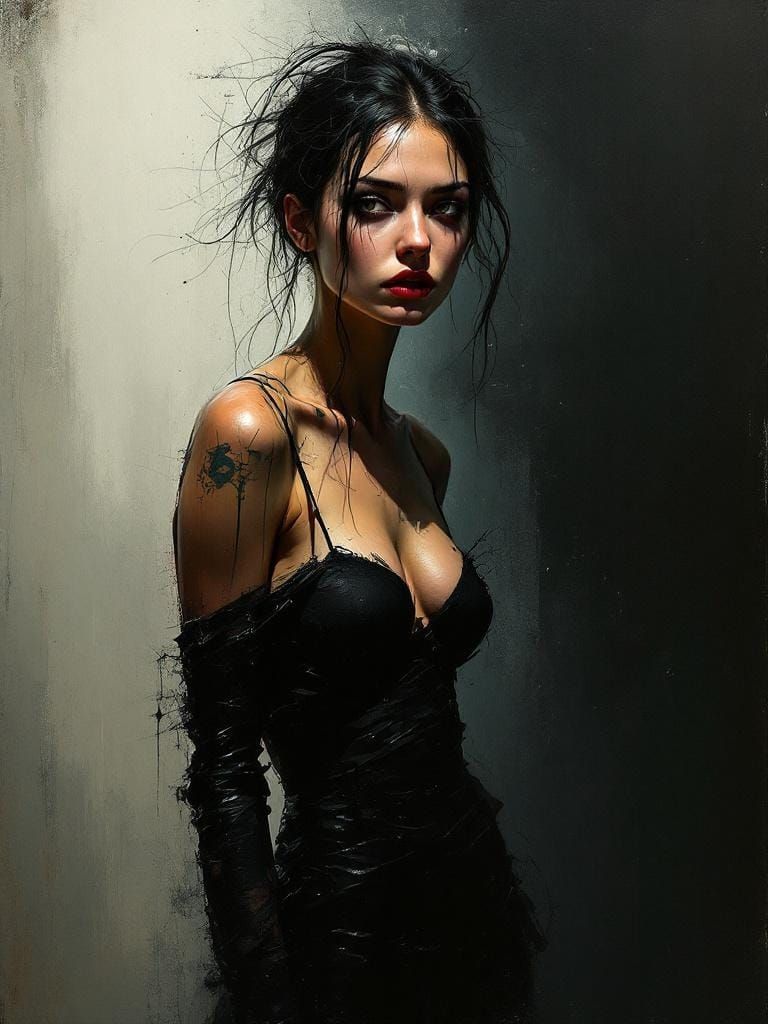 This image shows a classic full body female figure study in a dark studio setting with bold lighting and high contrast. It is rendered with expressive linework and distorted brushwork, creating a dynamic abstract piece.