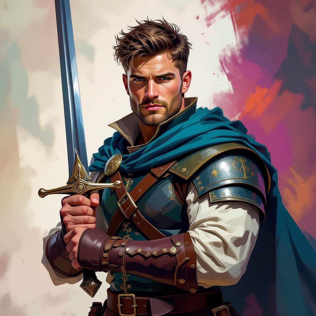 A vibrant image of Finn, a handsome young man in a heroic pose. Finn is holding his sword, with dramatic side lighting and rich color depth in a splash art style.