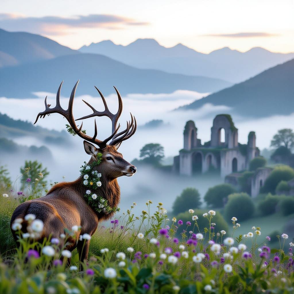 This image captures a majestic stag with wildflower-adorned antlers overlooking a misty valley. Crumbling ancient ruins are reclaimed by nature, depicted with dramatic lighting in a classical landscape style.