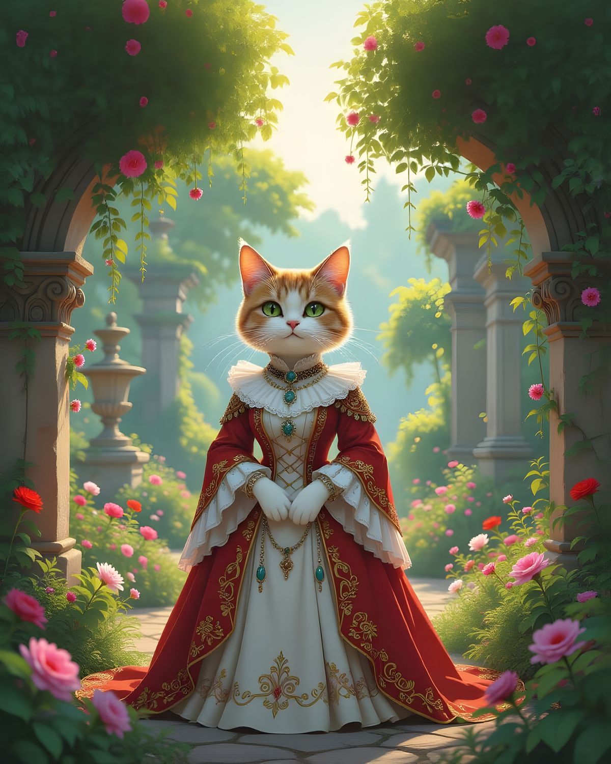 A majestic cat dressed in antique finery poses in an enchanted garden. The artwork blends classical painting with Studio Ghibli influences, featuring soft lighting and intricate details.