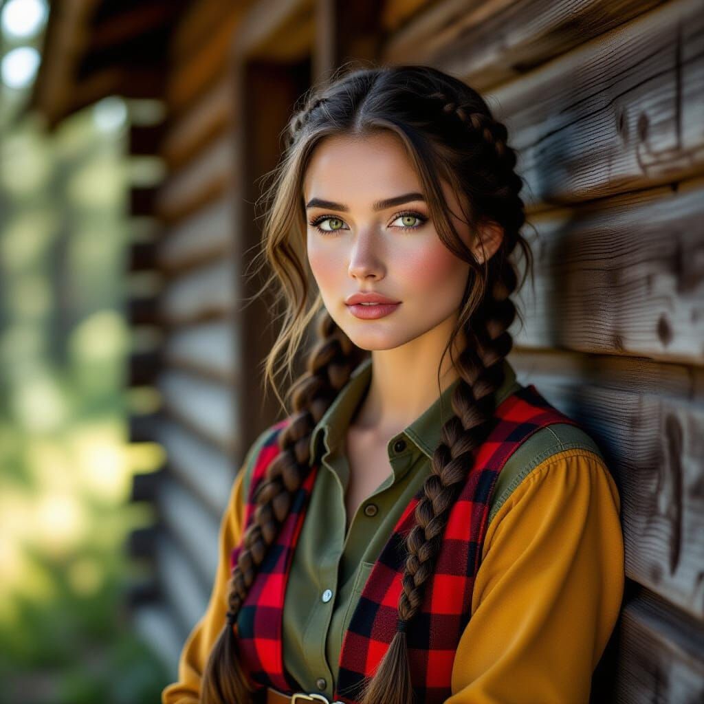 This image shows a beautiful young woman with long, dark, braided hair leaning near an old wooden cabin in a forest with soft ambient light. The ultra-realistic image evokes a cinematic atmosphere.