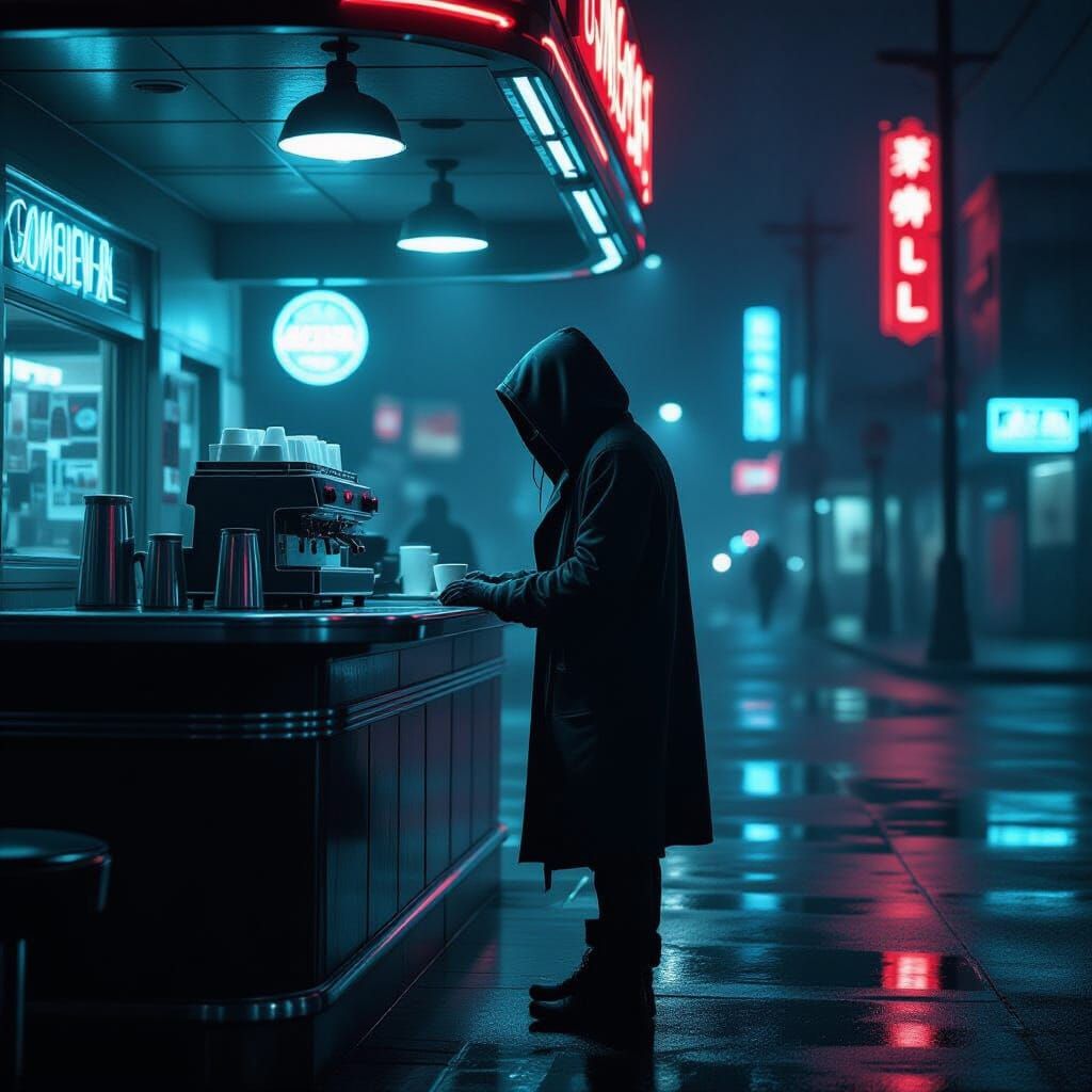 This image shows a weary, hooded figure at a retro-futuristic diner counter. Neon lights create a noir mood with deep shadows and stark highlights, in a gritty digital art style.