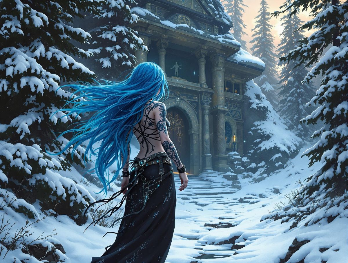A gothic explorer with electric-blue hair stands before a hidden temple in a snowy forest. This dark fantasy image evokes mystery and enchantment, inspired by gothic horror art.