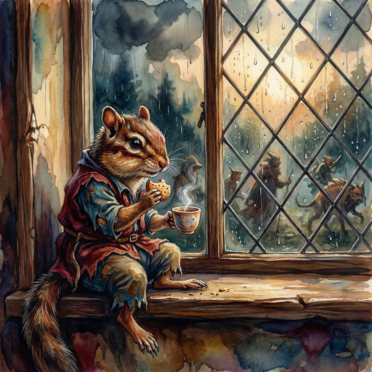 This image depicts an anthropomorphic chipmunk enjoying tea and biscuits by a rain-streaked window, rendered in a detailed, expressive watercolor and oil on canvas style with vivid colors.