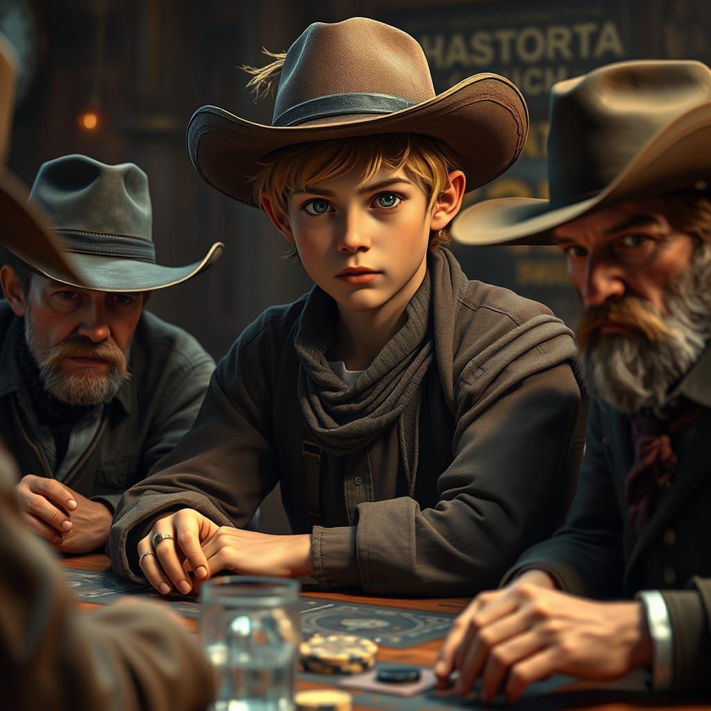 This image shows a blond teenage boy in cowboy clothes playing poker in a dimly lit saloon with grizzled cowboys. Dramatic lighting and hyper-realistic textures create a vibrant scene.