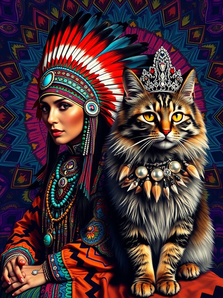 This stunning portrait combines the opulence of Art Deco with the intricate details of hyperrealism, featuring a Native American Indian and a Norwegian Forest cat posed in a dramatic, 2/3 face angle, half-body portrait, surrounded by a kaleidoscope of colors and textures