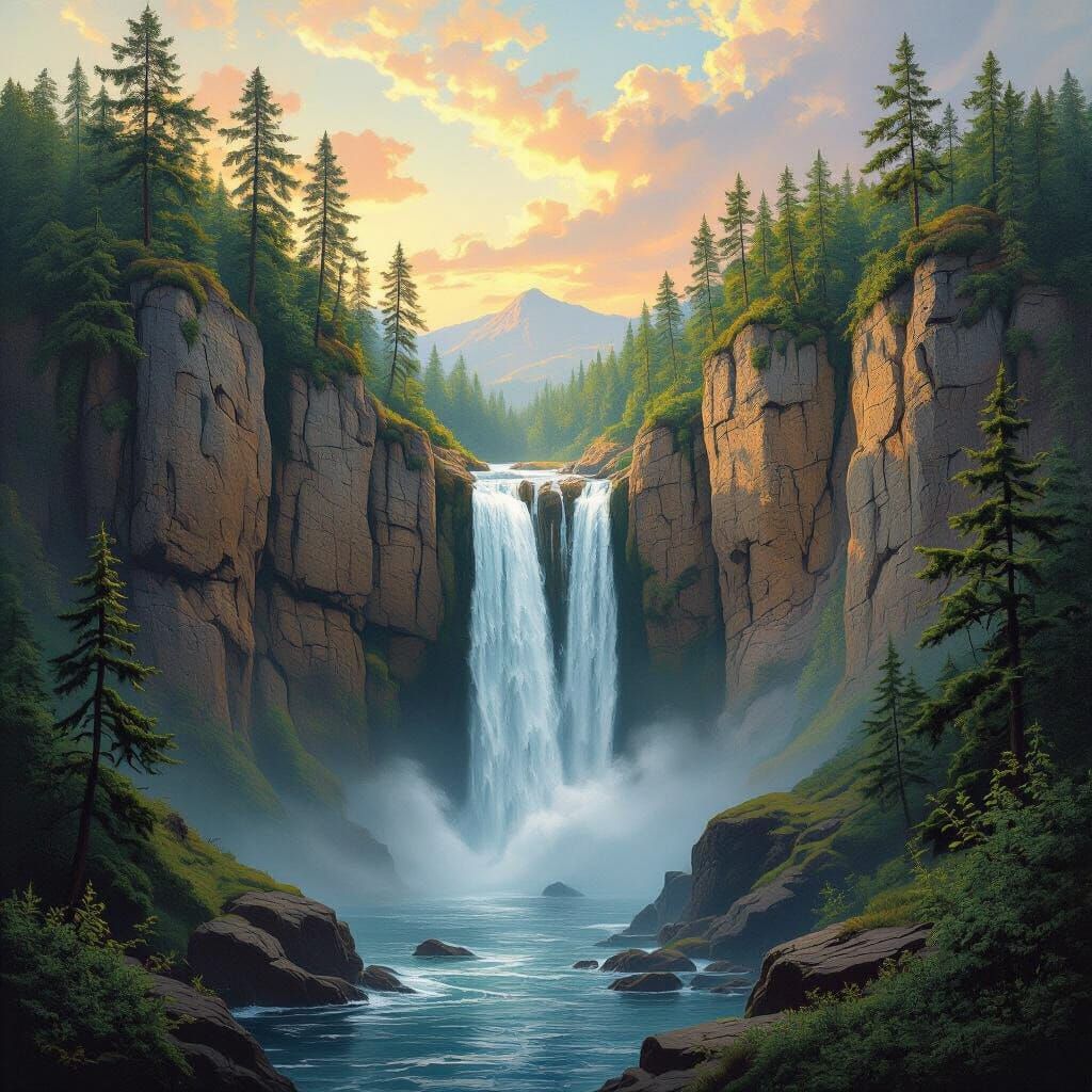 A serene waterfall flows between rugged cliffs, surrounded by lush trees. The image captures a romantic landscape painting style, reminiscent of 19th-century atmospheric vistas.